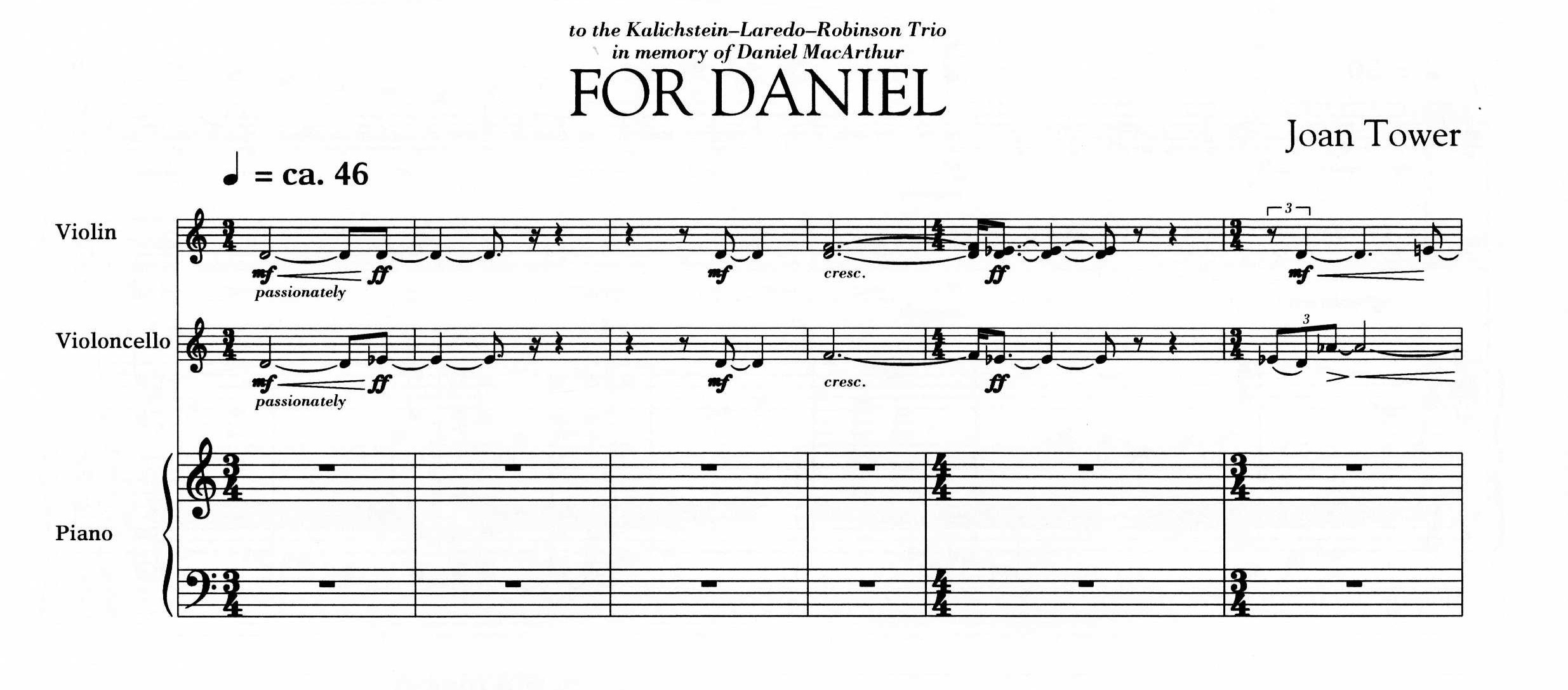 For Daniel was written for the Kalichstein-Laredo-Robinson Trio with a commission sponsored by John and Helen Schaefer of the Arizona Friends of Chamber Music. It is dedicated to Joan Tower’s nephew, Daniel MacArthur, who passed away in 2003 after a long illness.