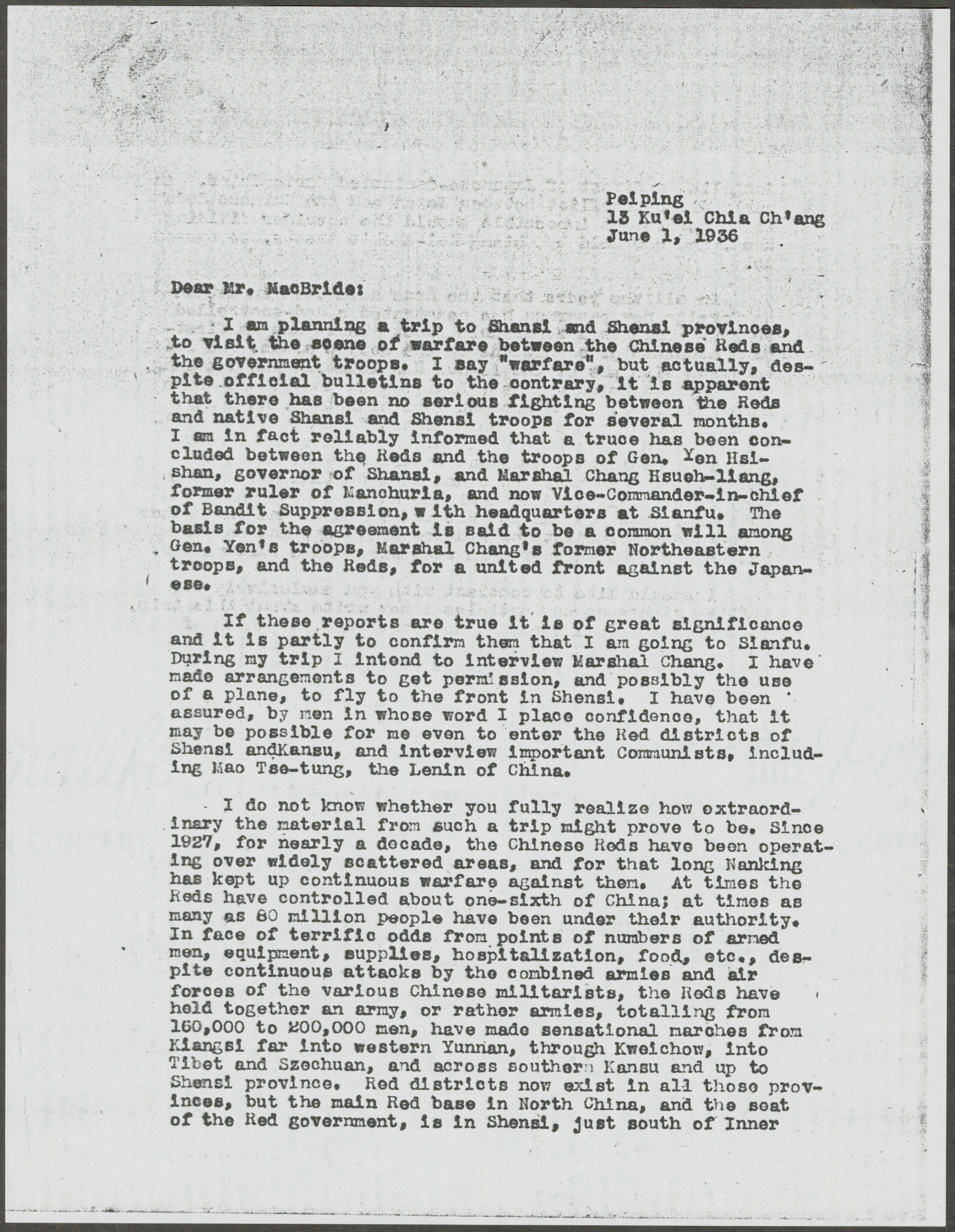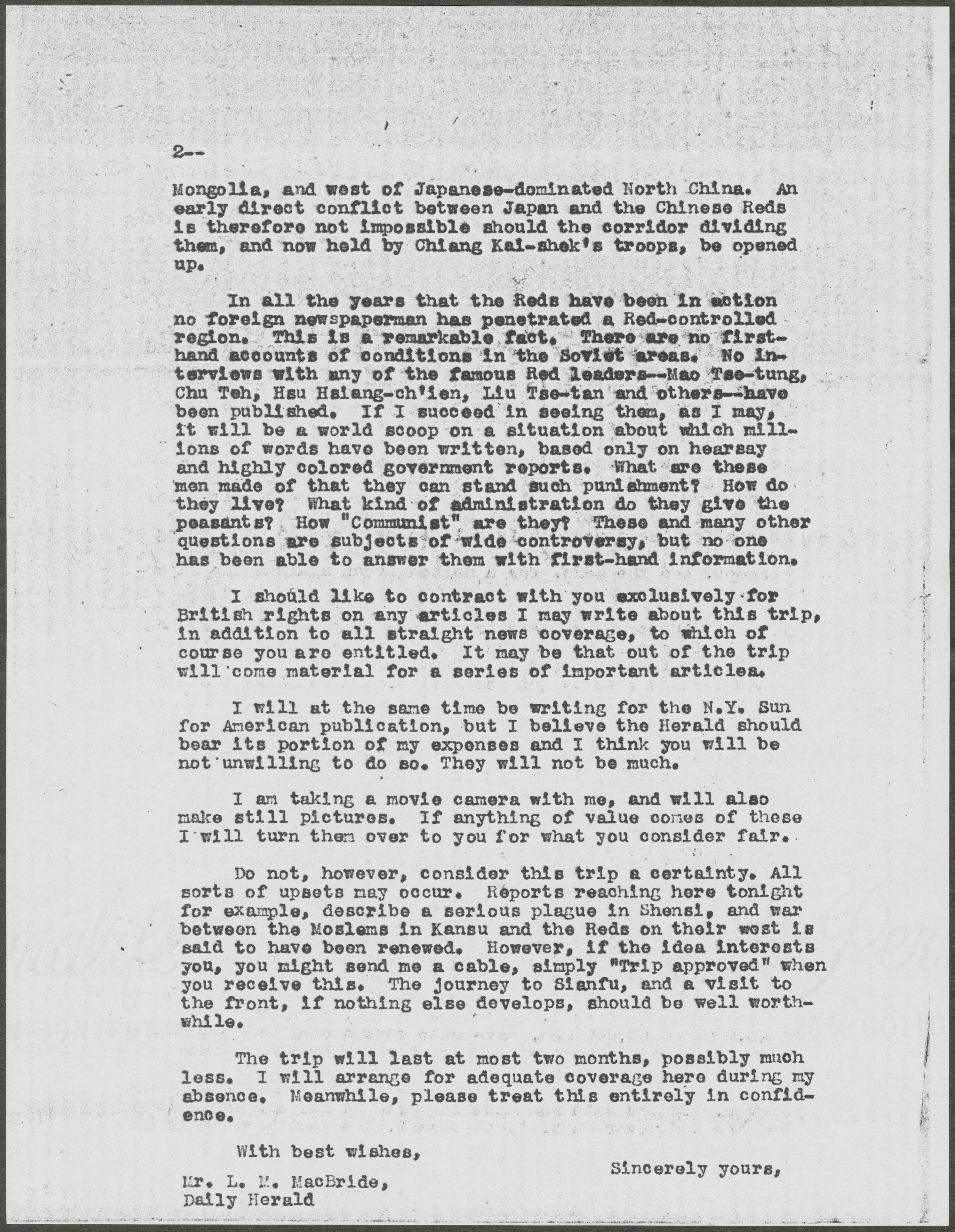 Snow's correspondence to Mr. L. M. MacBride, Foreign Editor of the Daily Herald in London, discussing his upcoming trip to Shansi (Shaanxi) and Shensi province of China. Snow mentions a possibility of entering the Red districts within these regions and becomes the first foreign journalist to interview the leaders of the Red Army, including Mao Tse-tung (Mao Zedong).