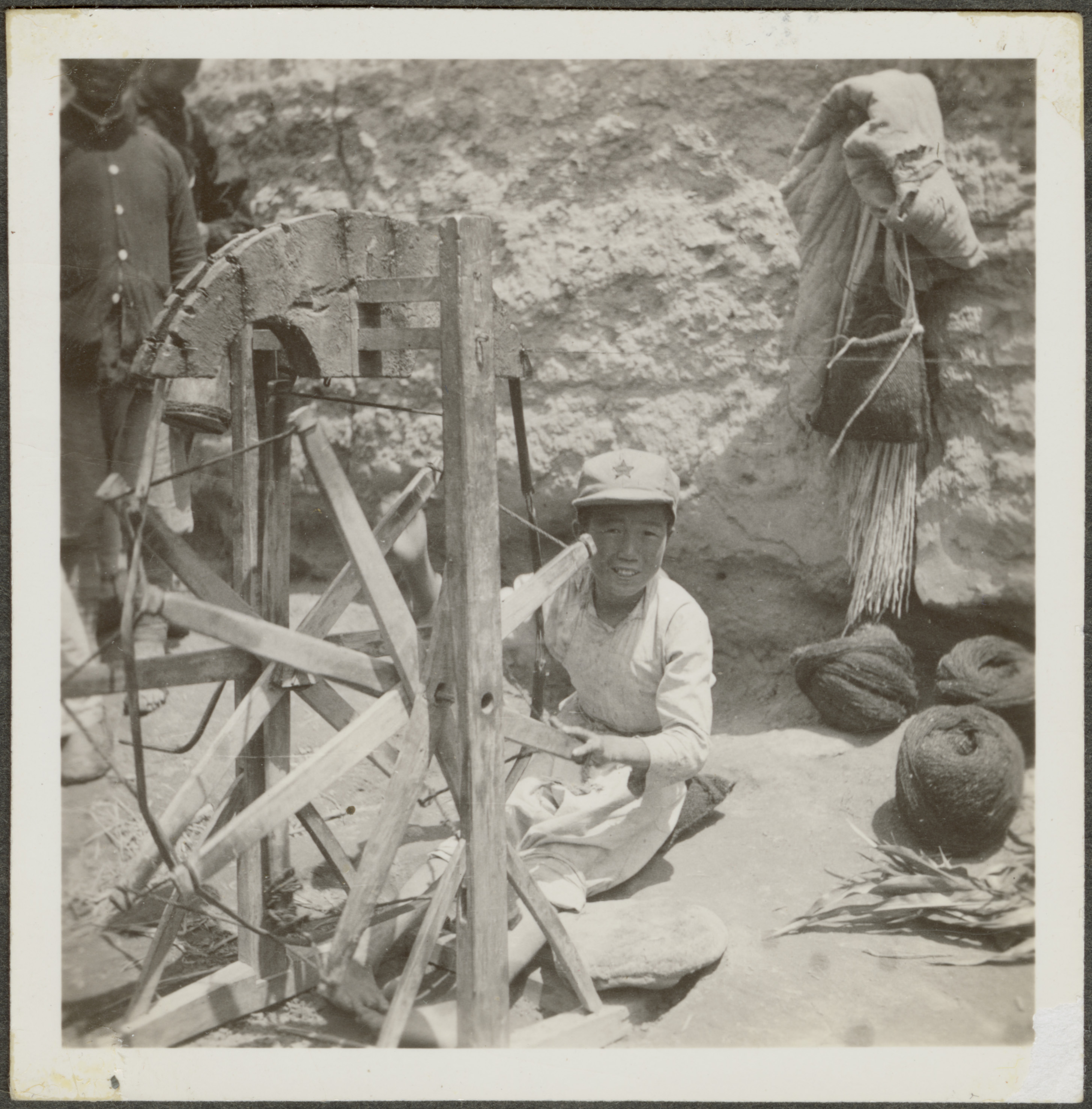 - A Red vanguard boy spinning wool for Red "factories" in Kansu, China.